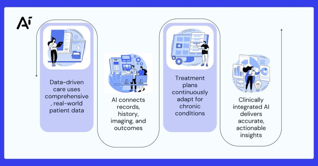 Data-driven healthcare extends beyond genomics. It includes longitudinal patient records, treatment histories, imaging data, and real-world outcome tracking. Personalized medicine AI connects these data points to guide ongoing treatment decisions.