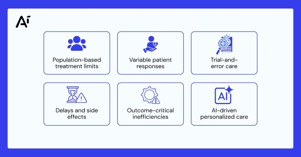 Personalized medicine AI addresses this limitation by analyzing patient-specific data at a scale that manual processes cannot handle. It enables clinicians to move from reactive decision-making to predictive and precise care planning.
