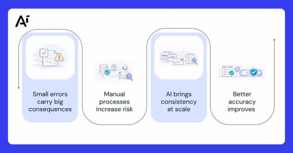 Accuracy in healthcare also depends on data integrity and compliance. AI systems can help detect inconsistencies, unauthorized access, and potential data breaches in real time.